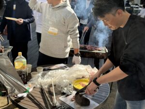 メインの食事タイムでは、会員自らが焼き係となり、七面鳥やシュラスコを振る舞う「おもてなし」を実施。